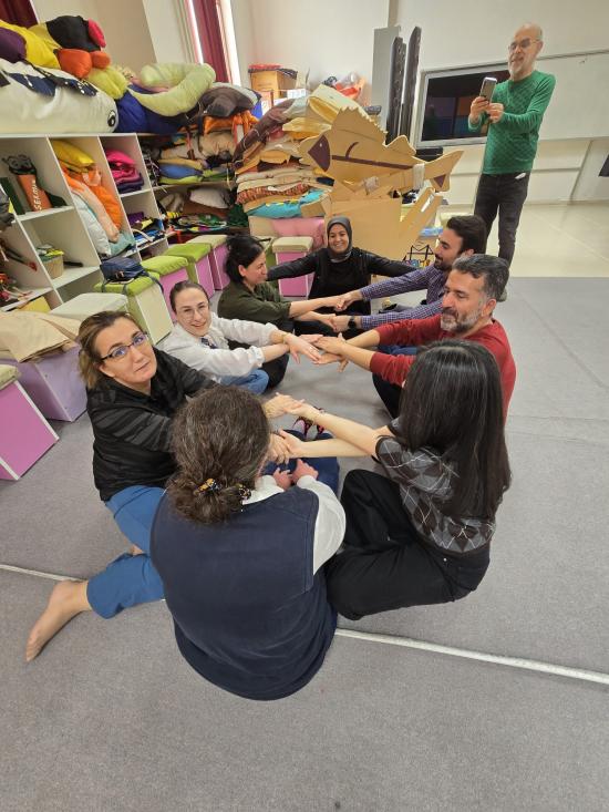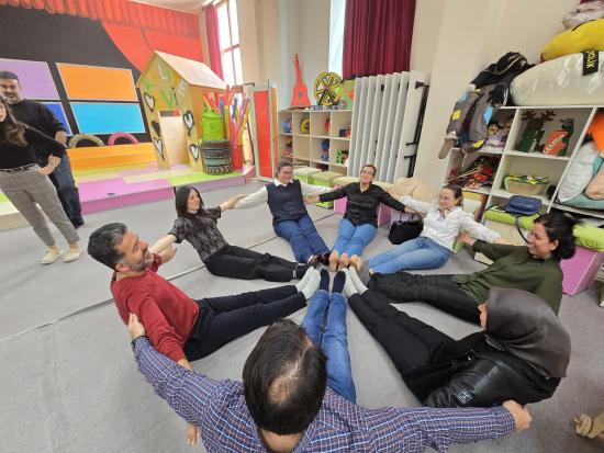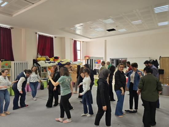Uygulama bölümünde müzik ve hareket temelli etkinlikler ön plana çıktı. Katılımcılar; eşleşme, yön bulma ve koordinasyon çalışmaları ile grup içi etkileşimi deneyimlerken, güven temelli uygulamalar aracılığıyla birlikte hareket etme, dikkat ve uyum becerilerini geliştirme fırsatı buldu. Küçük grup çalışmaları kapsamında gerçekleştirilen yaratıcı canlandırmalarla, günlük yaşam nesnelerinin beden diliyle ifade edilmesi üzerinden soyut düşünme ve yaratıcılık becerileri desteklendi. Tüm katılımcıların yer aldığı grup sahnesi oluşturma etkinliği ise iş birliği ve kolektif üretim açısından dikkat çekici bir öğrenme ortamı sundu.