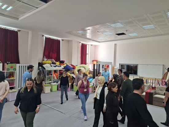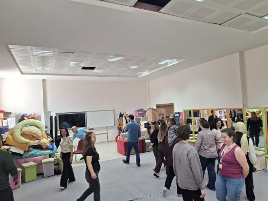 Atölye programı, etkileşimli etkinliklerle başladı. Bu çerçevede özellikle dokunsal, görsel ve işitsel öğrenme becerilerinin öğretim süreçlerindeki rolü vurgulandı. Uygulama bölümünde, çoklu duyusal öğrenme deneyimini destekleyen etkinlikler ön plana çıktı. Müzik ve ritim temelli çalışmalar işitsel öğrenmeyi desteklerken, hareket ve mekân kullanımı içeren etkinlikler dokunsal (kinestetik) öğrenme becerilerini harekete geçirdi. Katılımcılar; eşleşme, yön bulma ve koordinasyon çalışmaları ile grup içi etkileşimi deneyimlerken, görsel uyaranlara dayalı canlandırmalarla dikkat, algı ve anlamlandırma süreçlerini geliştirme fırsatı buldu.